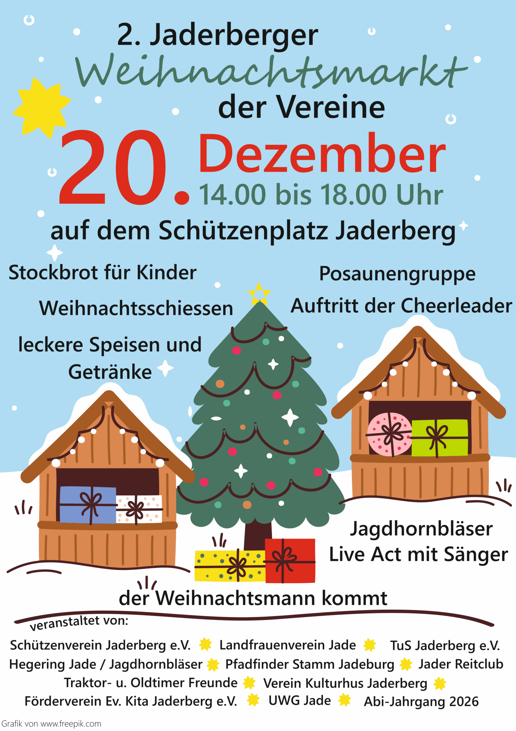 Am 20. Dezember von 14:00 bis 18:00 Uhr laden die Jaderberger Vereine zum zweiten gemeinsamen Weihnachtsmarkt auf dem Schützenplatz ein!