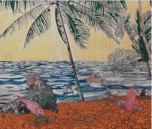 „Der Titel der Ausstellung „Palmen und Fische“ bezieht sich auf eine Abfolge von Ölbildern, in denen beide Motive eine zentrale Rolle spielen. Ein weiterer Grund für den Namen ist die Nähe des Ortes (Seefelder Mühle) zum Lebensraum Meer. Mit Palmen verbinden viele Menschen eine Sehnsucht nach Urlaub oder eine Urlaubserinnerung, mit Fischen etwas Kulinarisches oder Exotisches.