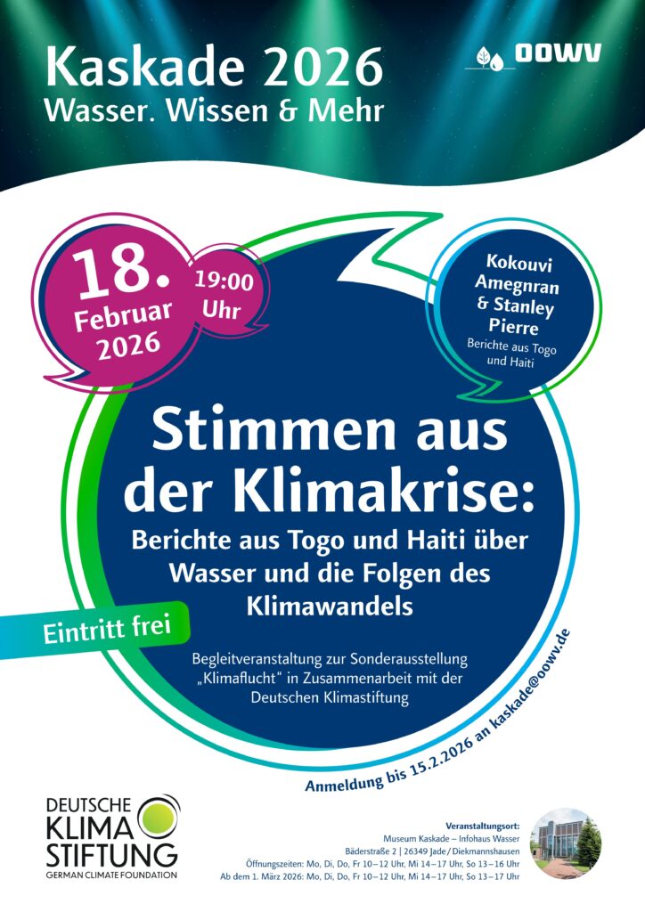 Dies ist eine Begleitveranstaltung zur Sonderausstellung KLIMAFLUCHT, welche noch bis zum 31. März im Museum Kaskade des OOWV zu sehen ist. Die Veranstaltung wird von OOWV in Zusammenarbeit mit der Deutschen Klimastiftung organisiert.